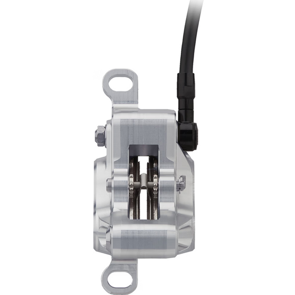Gracias al equilibrio preciso entre potencia de frenado y rigidez del sistema, combinado con una fricción mínima en el mecanismo de la palanca, logra una precisión de frenado instintiva. Una articulación de palanca acciona la palanca de freno, que acciona el pistón de la maneta de 9 mm que suministra aceite a los cuatro pistones de acero inoxidable de 14/17 mm de forma progresiva.